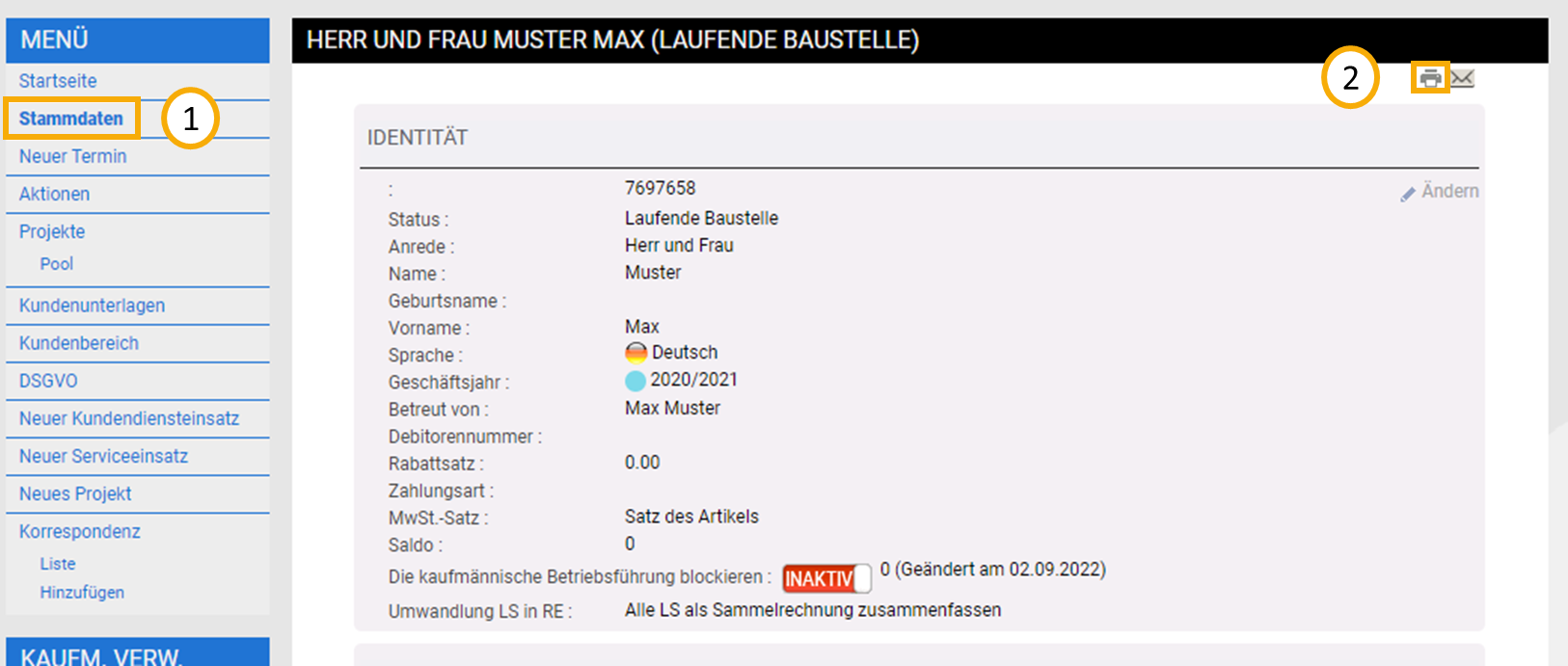 | Um das Datenblatt eines Kunden zu drucken, begebe Sie sich zunächst in die Stammdaten des jeweiligen Kunden (1). Klicken Sie anschließend auf der Drucker-Symbol (2). Folgen Sie anschließend den Anweisungen Ihres Druckers. |