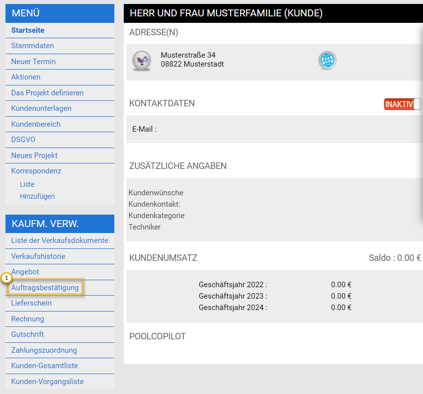 | Sie erstellen eine Auftragsbestätigung, indem Sie zuerst die Kundenadresse aufrufen und im Anschluss über den Menüpunkt "Kaufmännische Verwaltung" die "Auftragsbestätigung" auswählen. |