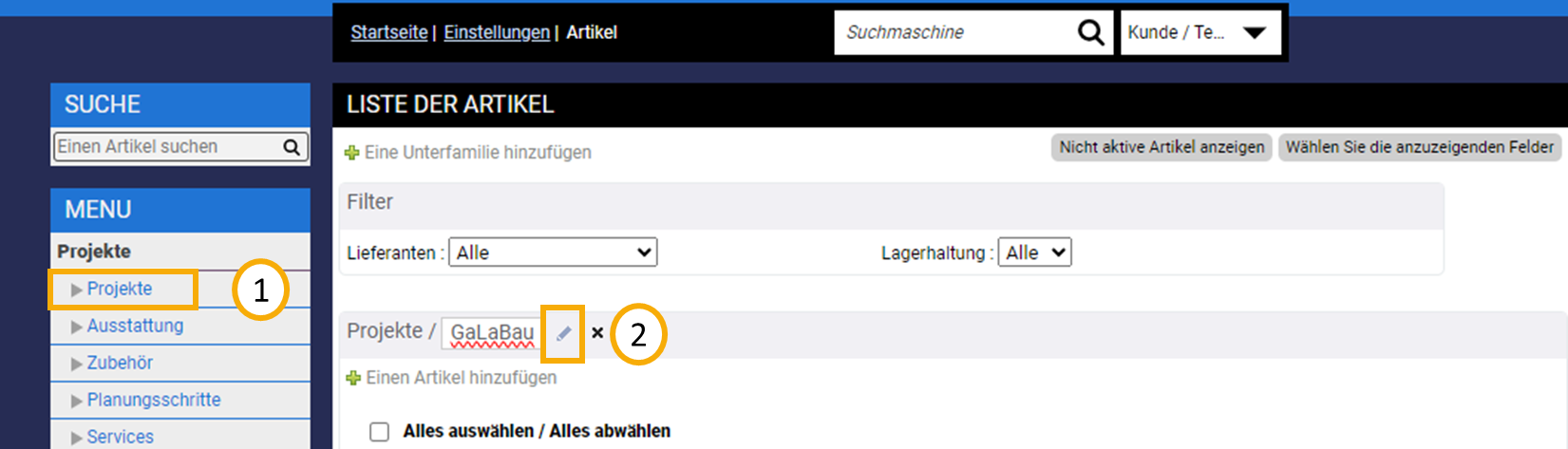 | Um eine Unterfamilie umbenennen zu können, öffnen Sie zunächst diejenige Familie (hier Projekt (1)), um die Unterfamilie einsehen zu können. Klicken Sie anschließend auf den Button in Form eines Stiftes (2), um die Bezeichnung der Unterfamilie zu ändern. |