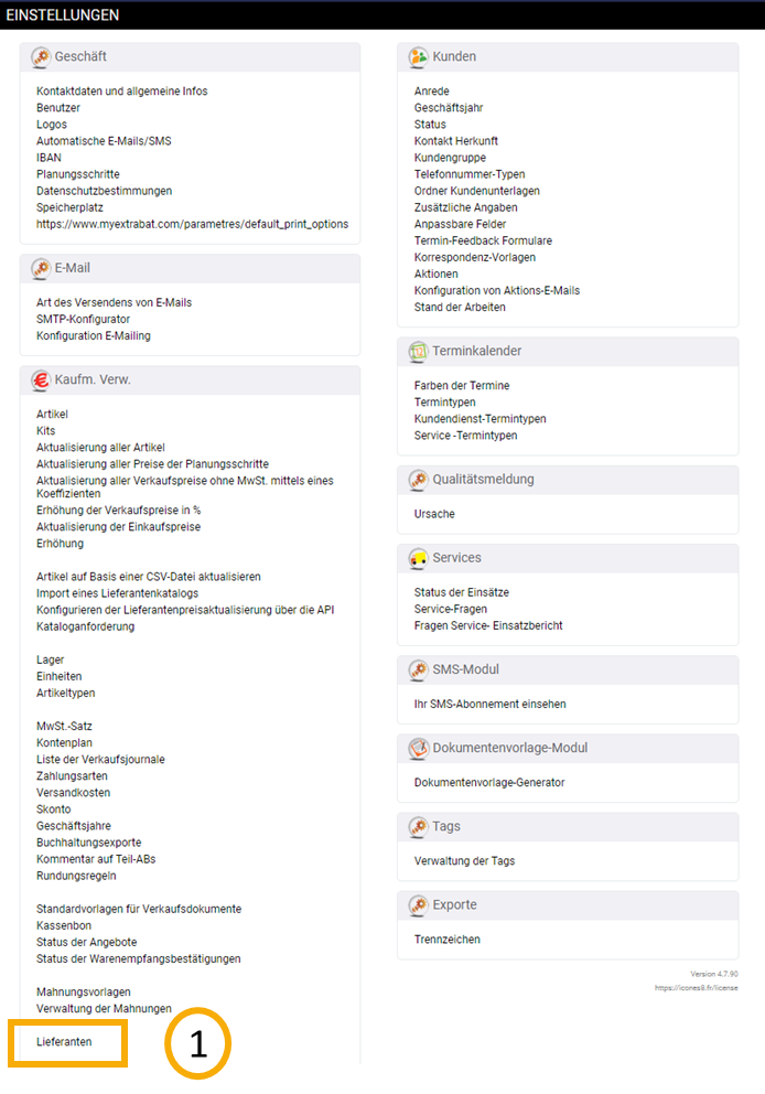 Um einen neun Lieferanten im Programm zu ergänzen, begeben Sie sich in die Einstellungen des Programmes. Dort sehen Sie weiter unten den Punkt Lieferanten.