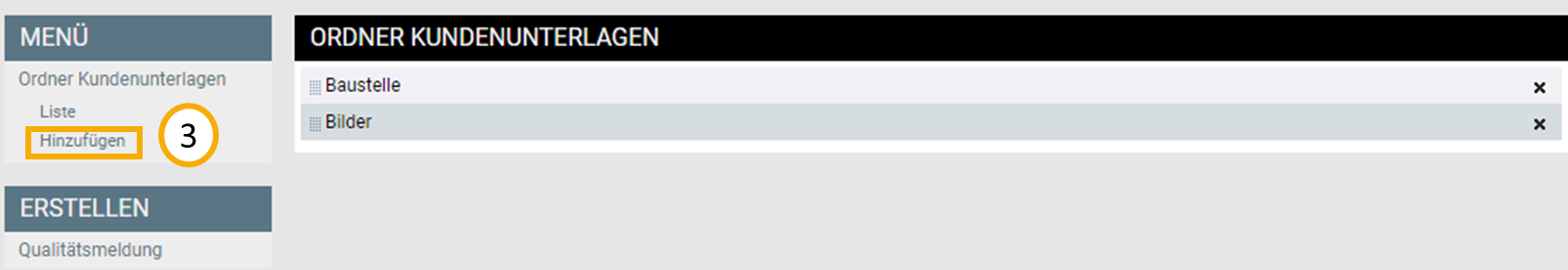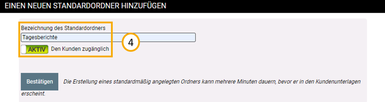 Geben Sie dem ordnen nun einen Titel und setzen Sie den Schieberegler auf "AKTIV", um den Ordner und dessen Inhalte für Ihre Kunden sichtbar zu machen (4).