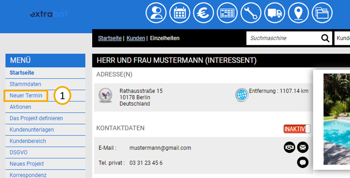 Um einen Termin zu einer Adresse erstellen zu können, navigieren Sie zunächst in die gewünschte Adresse. Klicken Sie anschließend auf den Button "Neuer Termin" (1).