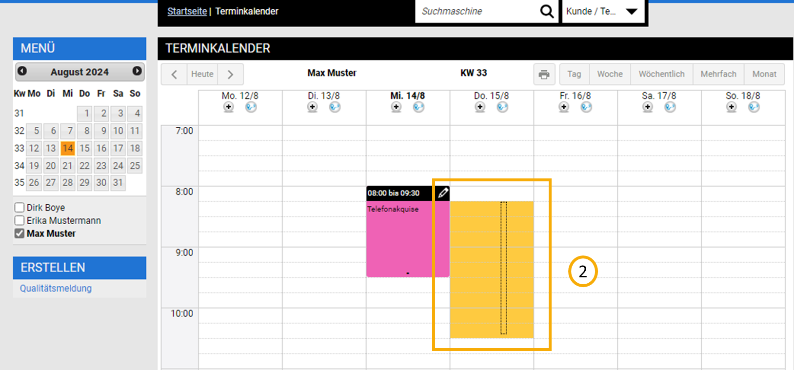 Markieren Sie anschließend mit linken Maustaste gedrückt denjenigen Zeitraum für den der Termin vorgesehen ist (2).