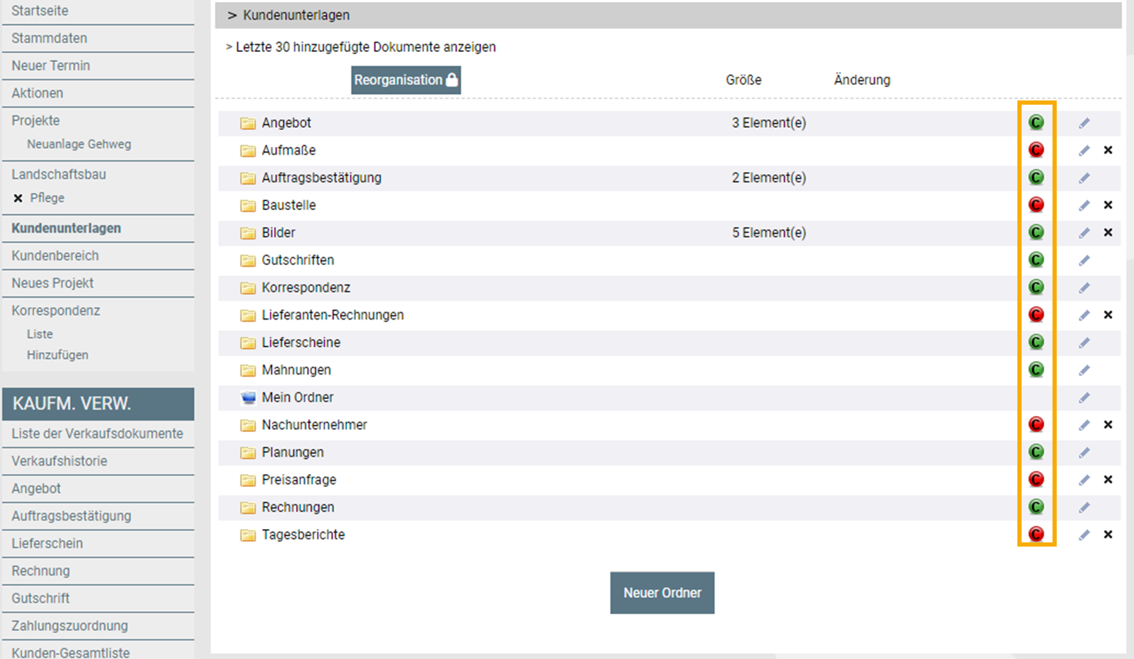 Sie können Ihren Kunden Ordner innerhalb derer Kundenunterlagen sichtbar machen, indem Sie auf das "C-Symbol" rechts in der jeweiligen Ordner-Zeile anklicken, sodass sich dieses grün färbt.