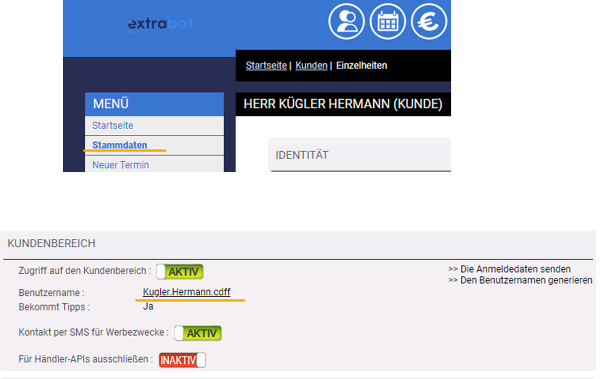 Um das jeweilige Kundenpasswort für den entsprechenden Kundenbereich einsehen zu können, navigieren Sie zunächst in die entsprechenden Stammdaten. Mit einem Klick auf den Benutzernamen erscheint ein Pop-Up Fenster mit dem Passwort.