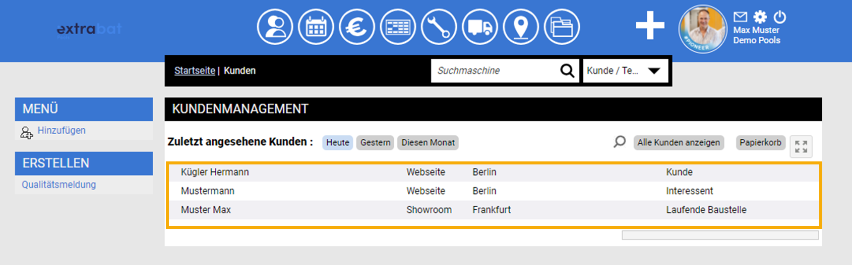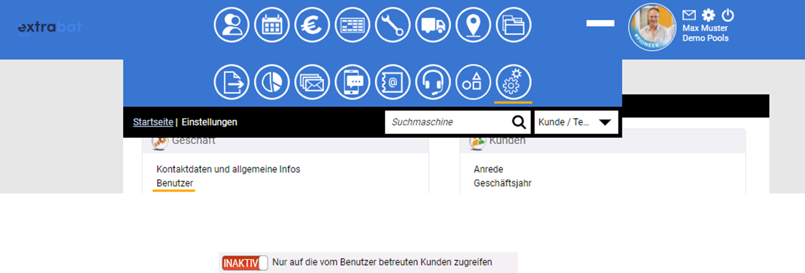 Sollten Sie sich wundern, warum Sie bei der Kundenübersicht nur die von Ihnen angelegten Kunden sehen, liegt dies an der Konfiguration Ihrer Benutzerrechte. Diese können in den Einstellungen entsprechend konfiguriert werden: