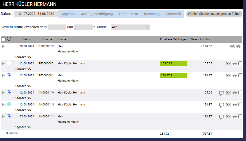 Sie erhalten nun eine Auflistung aller Dokumente für den oben gewählten Zeitraum.
