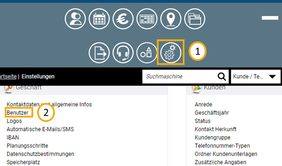 Ihre Kollegen können nicht die von Ihnen angelegten Kunden und Vorgänge bearbeiten, weil Ihnen höchstwahrscheinlich hierzu das Benutzerrecht fehlt. Prüfen Sie in Ihren Einstellungen (1) innerhalb Ihrer Benutzer (2),