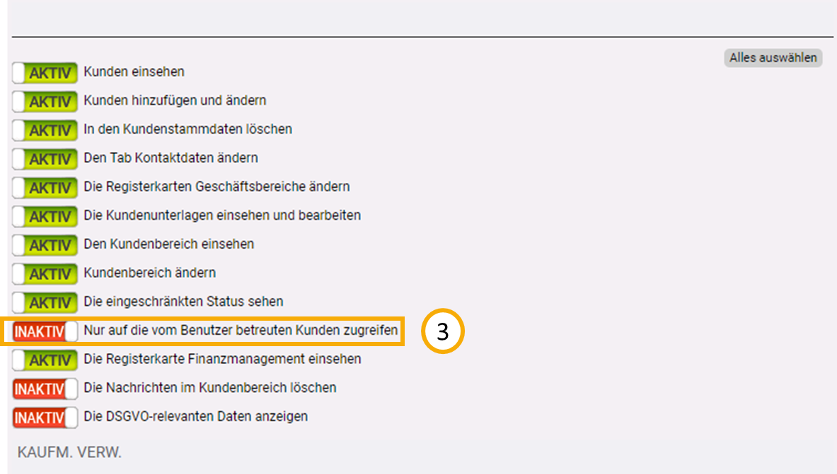 ob der entsprechende Schieberegler bei "Nur auf die vom Benutzer betreuten Kunden zugreifen" deaktiviert ist (3).