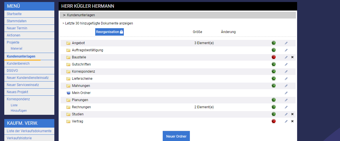 Möchten Sie die Dokumente zu einer Adresse anschauen, können Sie dies im Bereich "Kundenunterlagen". Hier finden Sie alle gespeicherten Dokumente.