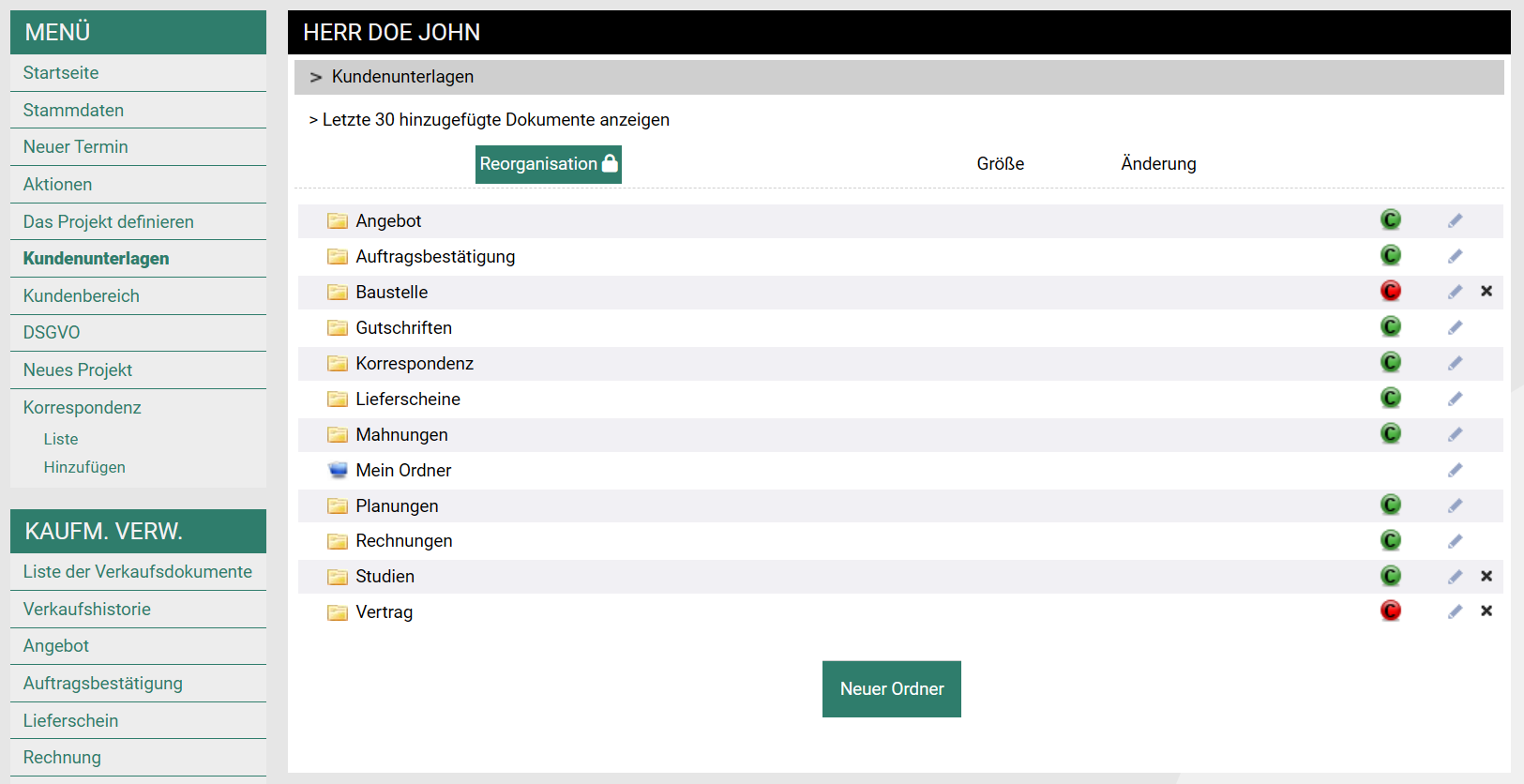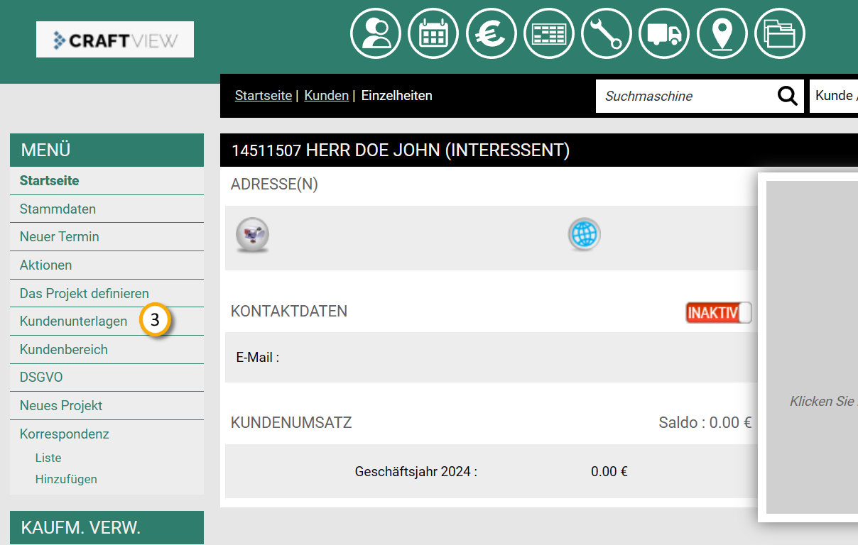 Wenn sie einen Kunden im Kundenbereich wählen, sehen Sie auf der linken Seite den Punkt "Kundenunterlagen".