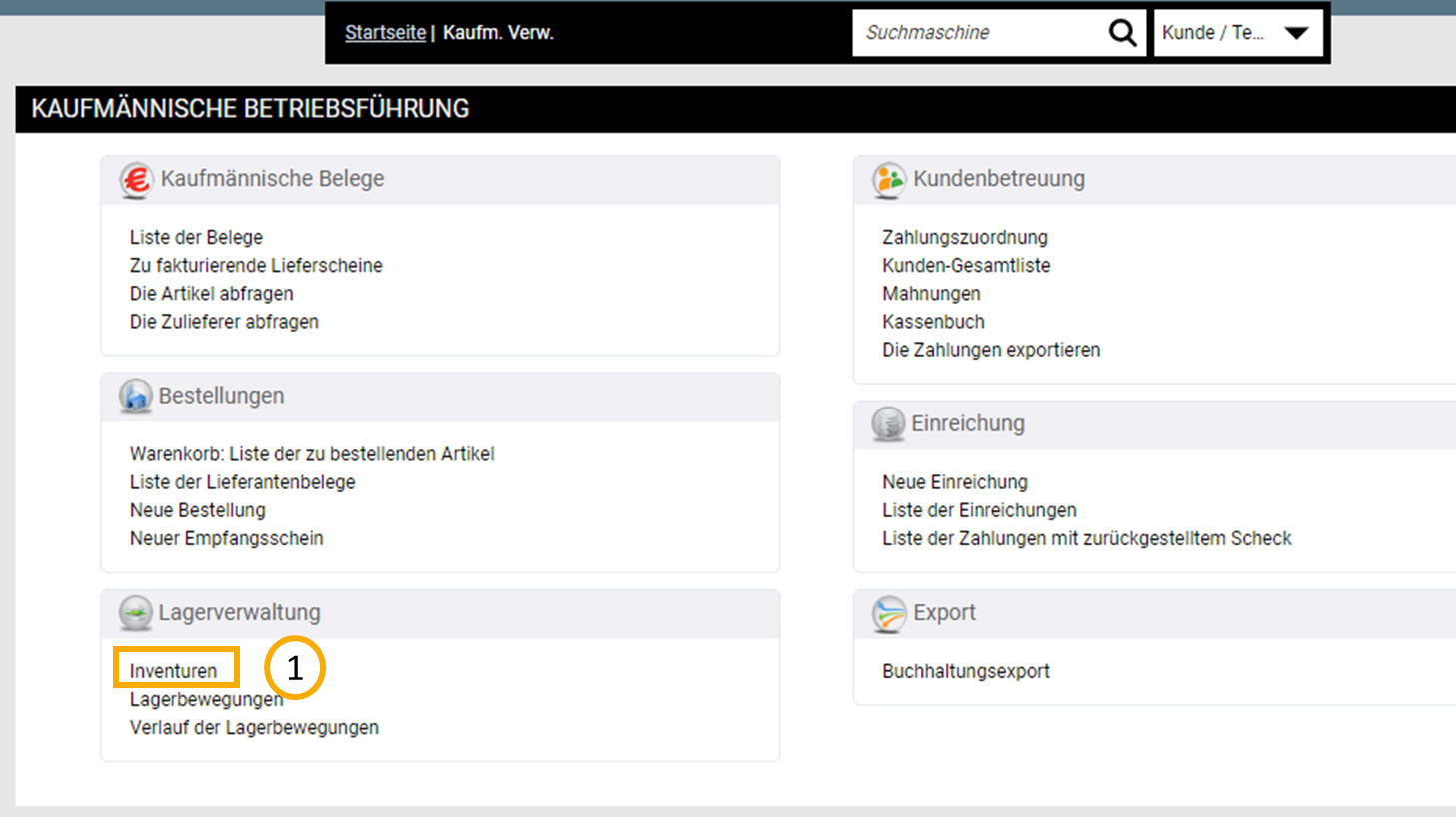 Um eine Inventur durchführen zu können, begeben Sie sich über das €-Zeichen in Ihre "Kaufmännische Betriebsführung" und dort in den Bereich "Inventur" (1).