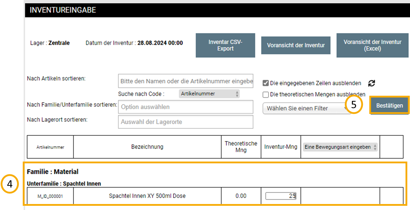 Sind Lagerartikel in den Stammdaten gekennzeichnet, können Sie nun die Anzahl definieren (4) und anschließend Ihre Eingabe bestätigen (5).