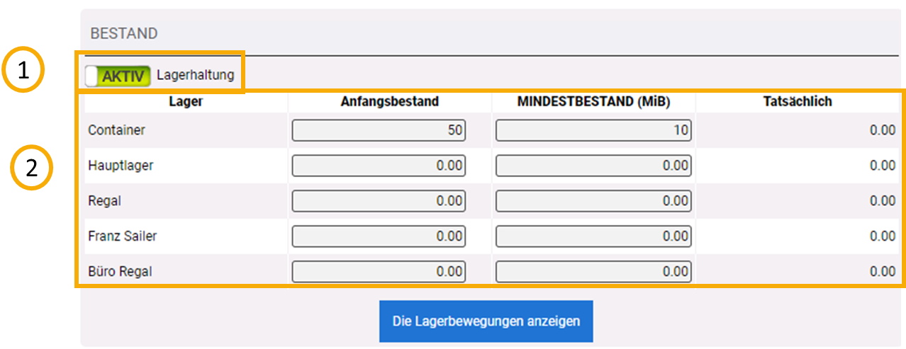 | Um eine Lagerbewegung buchen zu können gilt es zunächst bei Artikeln festzulegen, ob es sich um einen Lagerartikel handelt. Öffnen Sie einen Artikel und aktivieren Sie den Schieberegler bei "Lagerhaltung" (1). Sie können nun "Anfangs- und Mindestbestand" definieren (2). Der tatsächliche Bestand wird sich entsprechend des Anfangsbestandes anpassen, sobald Sie ihre Artikeleingabe bestätigt haben. |