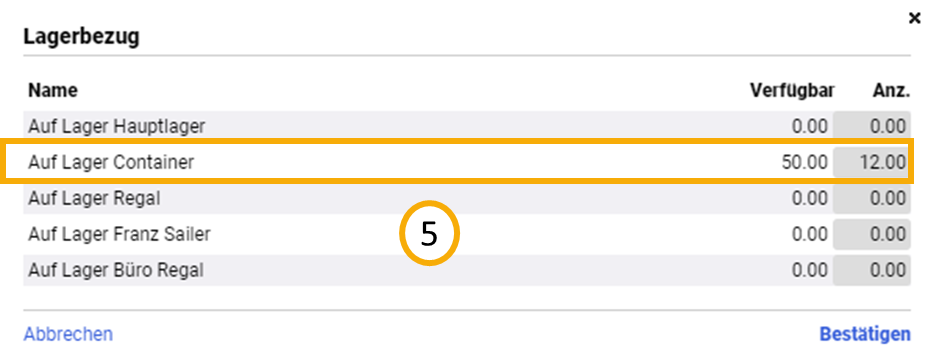 Legen Sie im Anschluss fest welches Lager für den Transfer hinzugezogen werden soll (5).