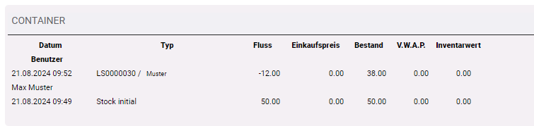 Wenn Sie nun Ihren Artikel im Nachgang öffnen, so werden Sie eine Lagerbewegung von 12 Artikeln feststellen können, wodurch sich der Bestand von 50 auf 38 reduziert hat (6).