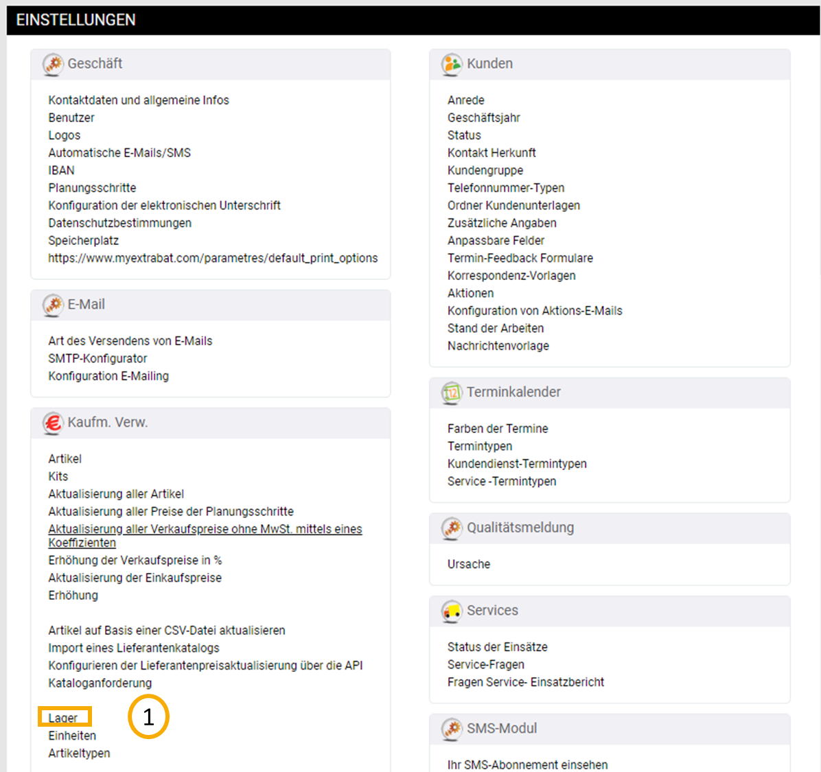 Die Lagerverwaltung hat die Aufgabe Ihren Artikelbestand im Lager transparent darzustellen. Um diese nutzen zu können, legen Sie sich zunächst ein Lager an. Gehen Sie hierzu in Ihre Einstellungen und navigieren Sie in den Unterbereich "Lager" (1).