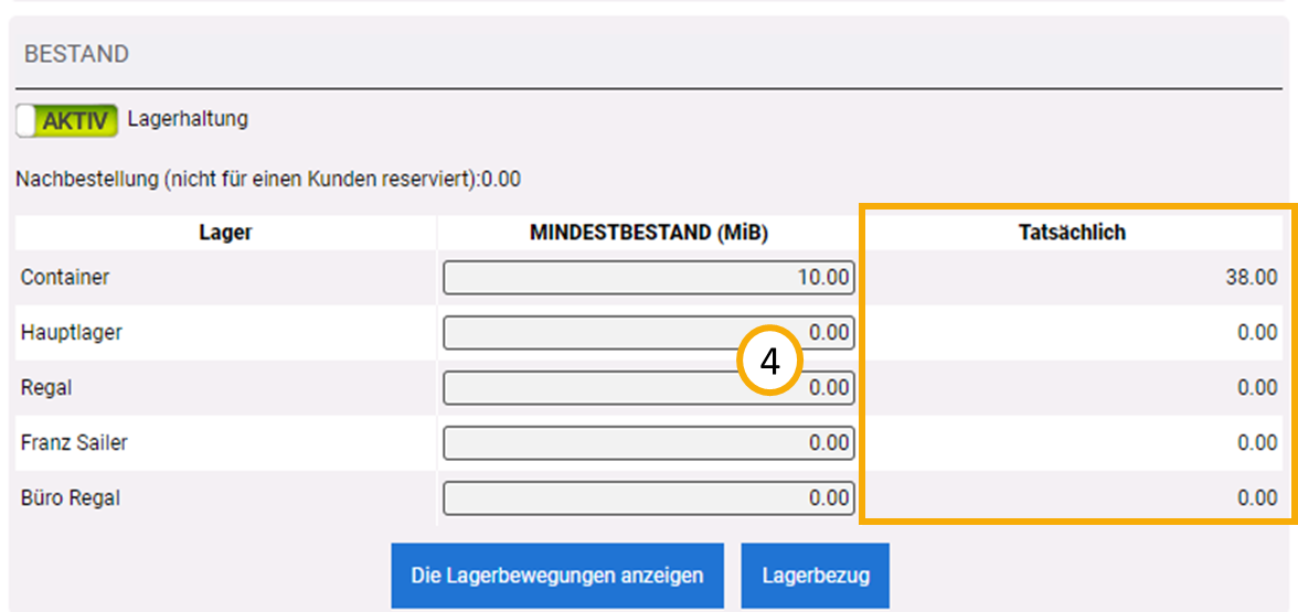 Werden nun beispielsweise über Lieferscheine bestimmte Lagerartikel "verwendet", so lassen sich die Bestandsänderungen hier ebenfalls nachvollziehen (4). Die folgende Abbildung zeigt, wie in einem Lieferschein 12 Artikel von einem Anfangsbestand von 50 abgezogen wurden.