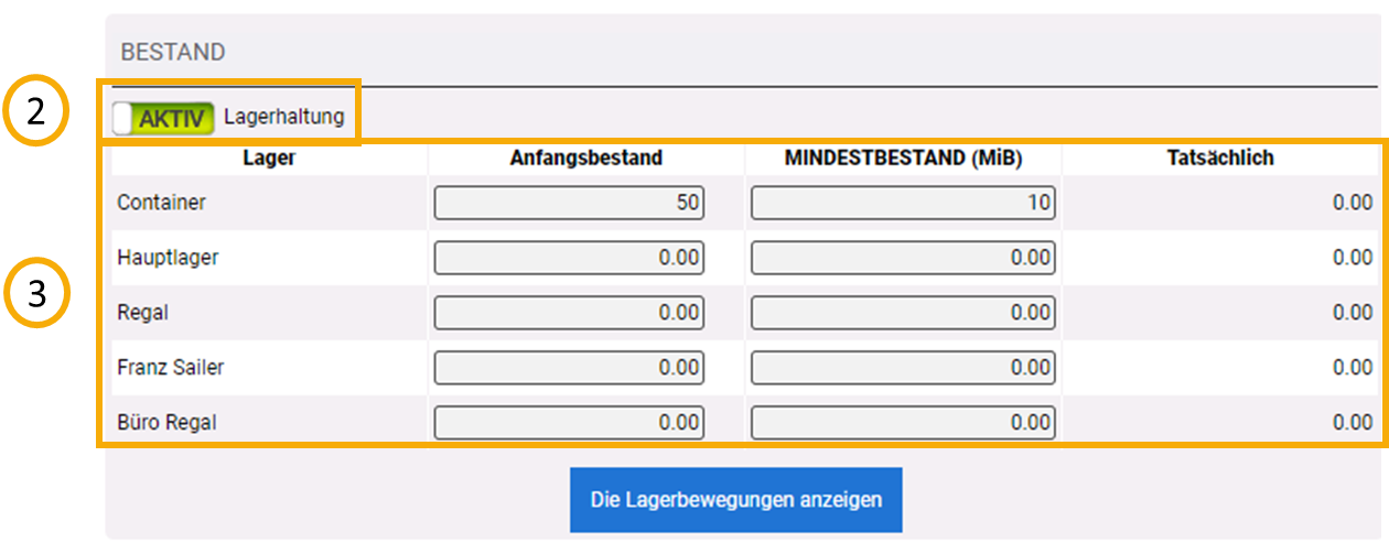 Anschließend gilt es bei Artikeln festzulegen, ob es sich um einen Lagerartikel handelt. Öffnen Sie einen Artikel und aktivieren Sie den Schieberegler bei "Lagerhaltung" (2). Sie können nun "Anfangs- und Mindestbestand" definieren (3). Der tatsächliche Bestand wird sich entsprechend des Anfangsbestandes anpassen, sobald Sie ihre Artikeleingabe bestätigt haben.