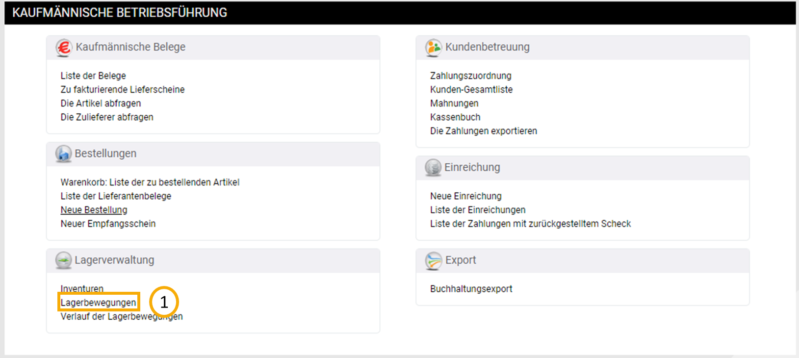 Um einen Lagerartikel von Lager A in Lager B umzubuchen begeben Sie sich über das €-Zeichen in Ihre "Kaufmännische Betriebsführung" und dort in den Bereich "Lagerbewegung (1).