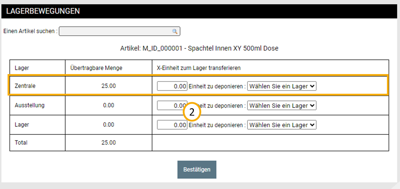 Definieren Sie anschließend aus welchem Lager der Artikel in das neue Lager umgebucht werden soll (2).