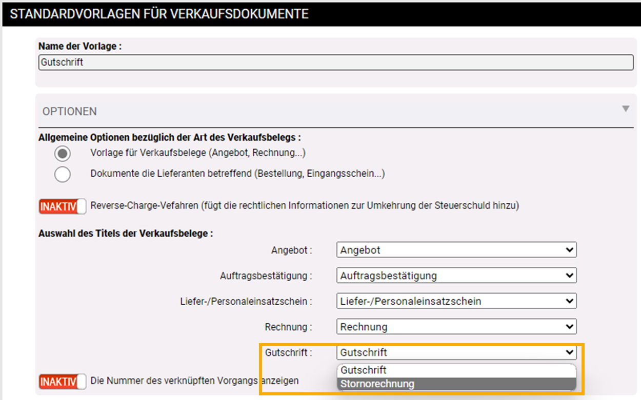 Eine Stornorechnung wird in unserer Software funktionell als Gutschrift verstanden, die Sie im "Dokumentenvorlagen-Generator" entsprechend Ihrer Vorstellungen umbenennen können.