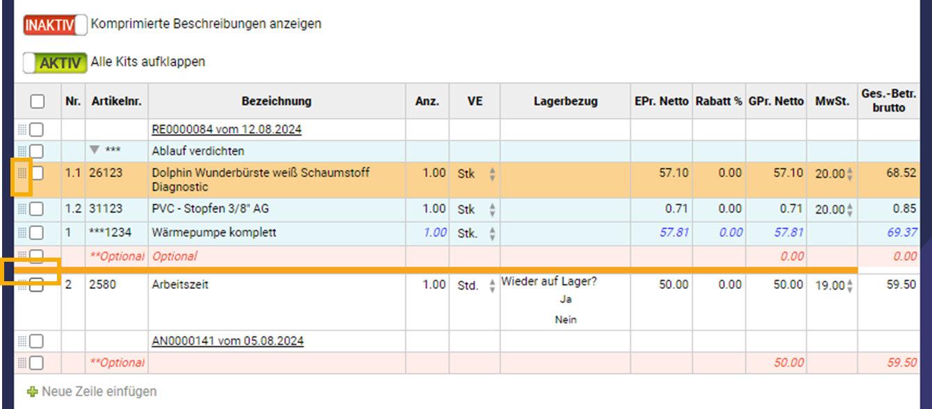 Möchten Sie einen in einen optionalen Bereich weitere bestehende Positionen ergänzen, können Sie diese ganz einfach vorne markieren und anschließend mit der Maus an die gewünschte Stelle ziehen: