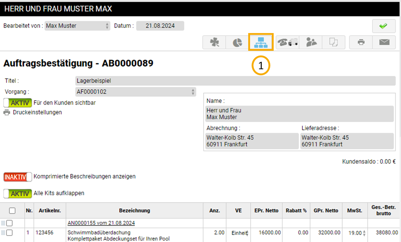 Um mehrere prozentuale Abschlagsrechnung schreiben zu können, stellen Sie zunächst sicher, dass Sie Ihr Angebot in eine Auftragsbestätigung umgewandelt haben. Klicken Sie anschließend auf den Button, der sie in das Abschlagsrechnungsmenü führt (1).