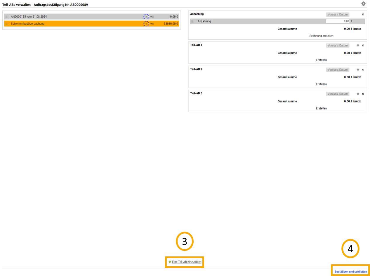 Ergänzen Sie bei Bedarf weitere Abschlagsrechnungen (3) und bestätigen Sie Ihre Eingabe mit "Bestätigen und Schließen" (4).