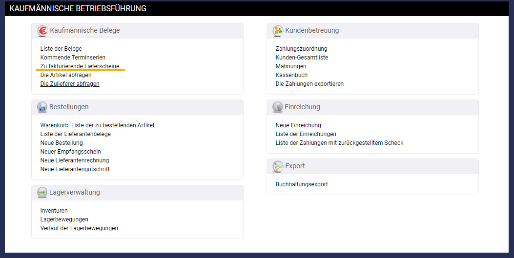 Gibt es eine Liste, welche mir die noch zu fakturierender Lieferscheine zeigt? 13. September 2024 07:59 Aktualisiert Sofern Sie eine Liste der noch zu fakturierender Lieferscheine suchen, finden Sie diese wie folgt: Kommentare 0 Kommentare Bitte melden Sie sich an, um einen Kommentar zu hinterlassen.