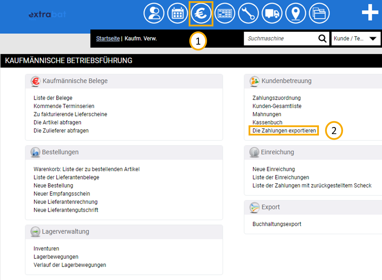 Um Ihre Zahlungen für einen bestimmten Zeitraum einsehen und exportieren zu können, begeben Sie sich zunächst in den Bereich der "Kaufmännischen Belege" (1). Dort navigieren Sie anschließend in den Unterpunkt "Die Zahlungen exportieren" (2).