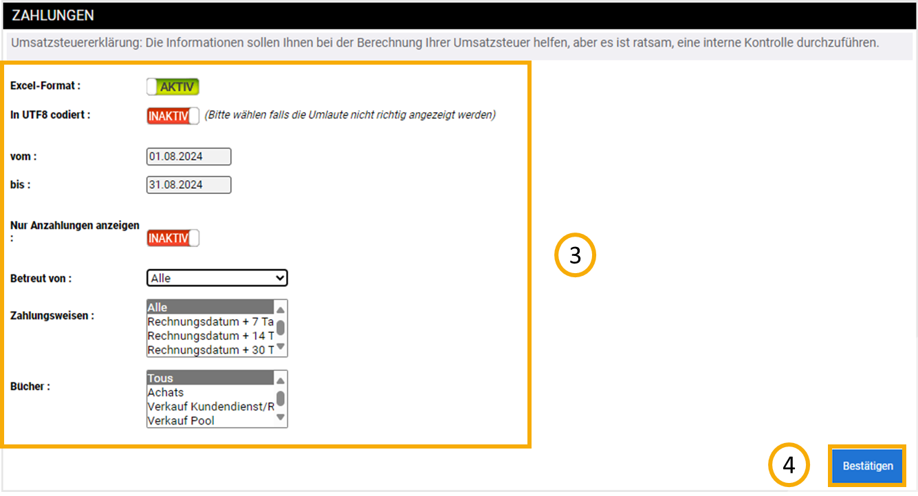 Definieren Sie anschließend anhand welcher Kriterien der Export durchgeführt werden soll (3) und klicken Sie anschließend mit "Bestätigen" (4). Der Download der Datei folgt im Anschluss automatisch.
