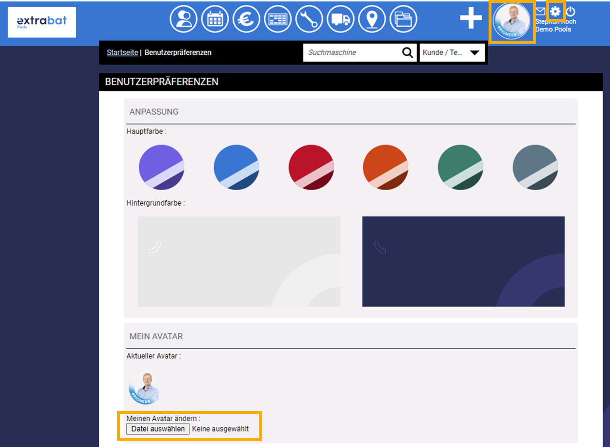 Möchten Sie Ihr Benutzerprofilbild einstellen, können Sie über ein Klick auf das Zahnradsymbol ganz oben rechts. Anschließend finden Sie die hier die Möglichkeit eine Bilddatei auszuwählen: