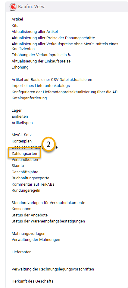 Sobald Sie sich in den Bereich befinden, können Sie dort auf unter der Rubrik "Kaufmännische Verwaltung" auf den Punkt "Zahlungsarten" klicken:
