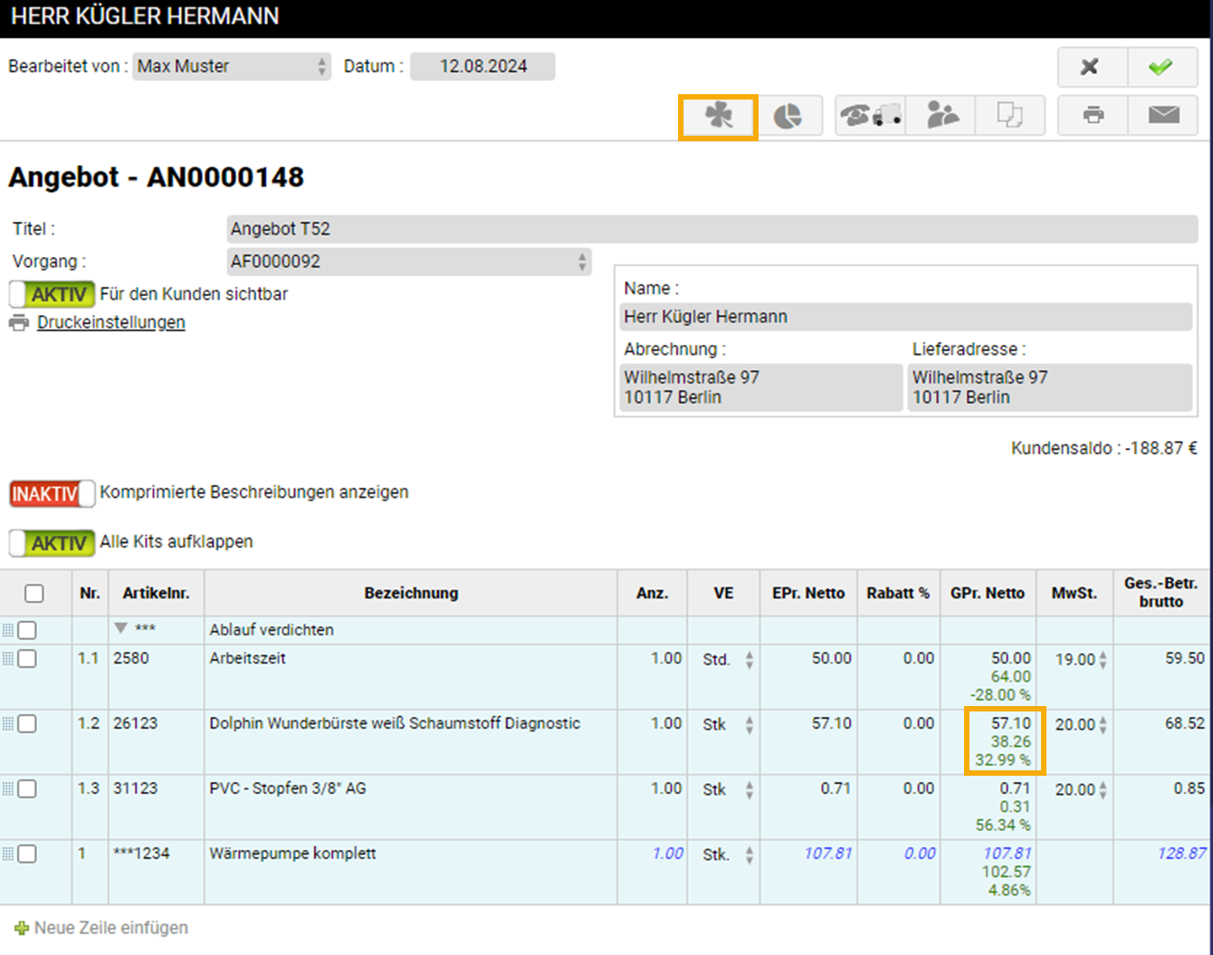Möchten Sie sich die Margen der einzelnen Positionen in Ihrem Angebot anzeigen lassen, ist dies durch einen entsprechenden Klick auf die Funktion oben möglich: