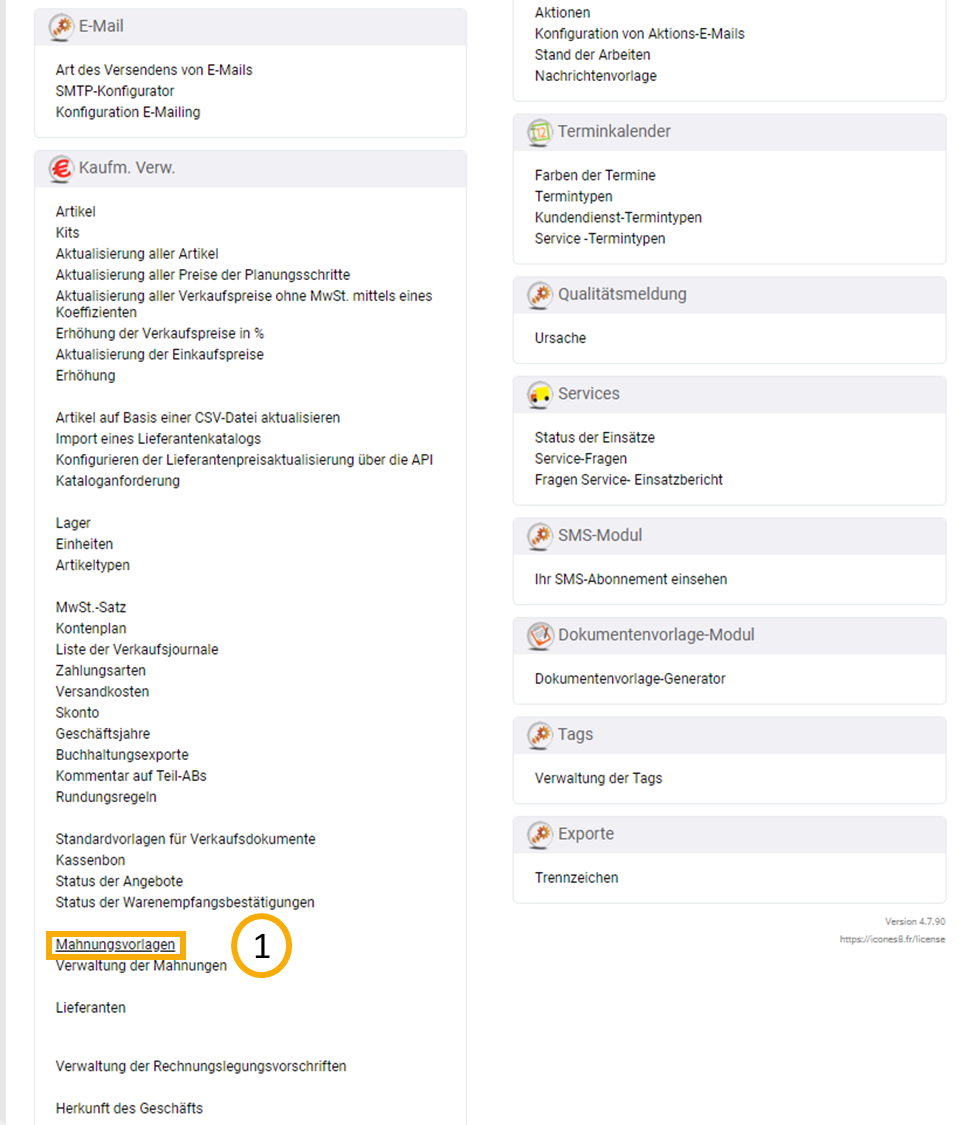 Sie können den Standardtext für jede Mahnvorlage ändern. Gehe Sie hierzu in den Einstellungen in den Bereich Mahnvorlagen (1).