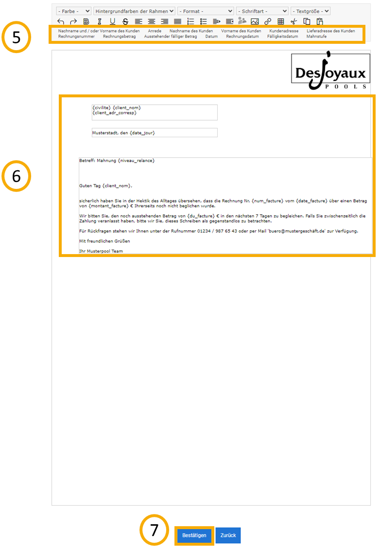 Ändern Sie nun Ihren Mahnungsinhalt nach Ihren Vorstellung ab. Beachten Sie dass Sie Variablen (Tags) haben (5) und die Textpassage (6). Bestätigen Sie abschließend Ihre Eingabe (7).