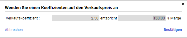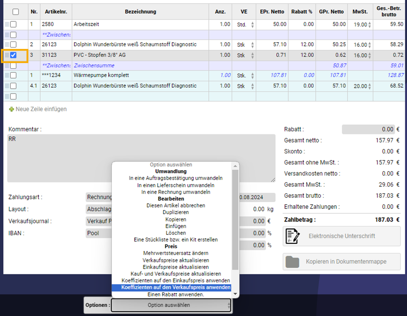 Möchten Sie für bestimmte Positionen einen Koeffizienten auf den Verkaufspreis anwenden, markieren Sie zunächst die gewünschten Positionen und wählen dann die passende Option: