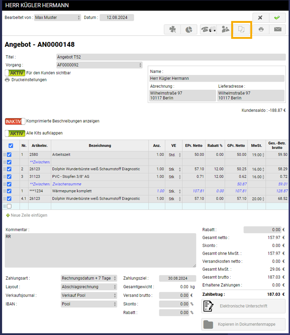 Möchten Sie eine Kopie von Ihrem Dokument erstellen und alle Positionen entsprechend übertragen, gibt es hierfür den passenden Button: