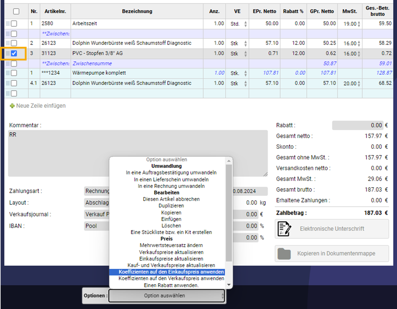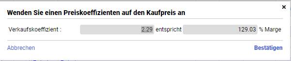 Möchten Sie für bestimmte Positionen einen Koeffizienten auf den Einkaufspreis anwenden, markieren Sie zunächst die gewünschten Positionen und wählen dann die passende Option: