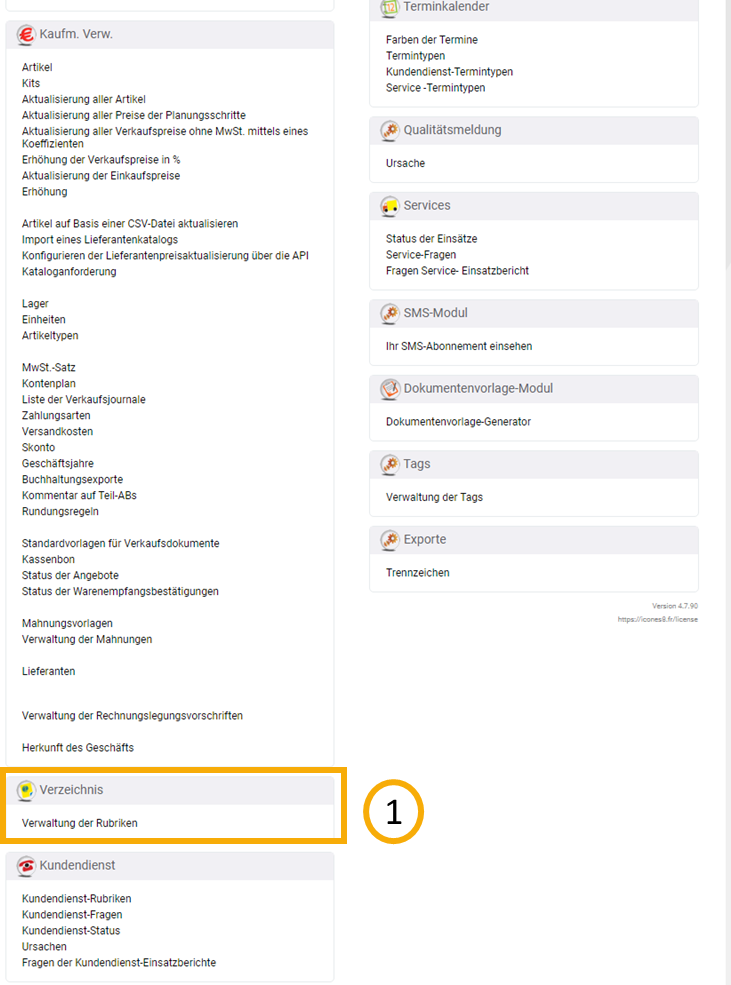 Um Rubriken in Ihren Verzeichnissen erstellen zu können, navigieren Sie zunächst in den unteren Bereich Ihrer Einstellungen.