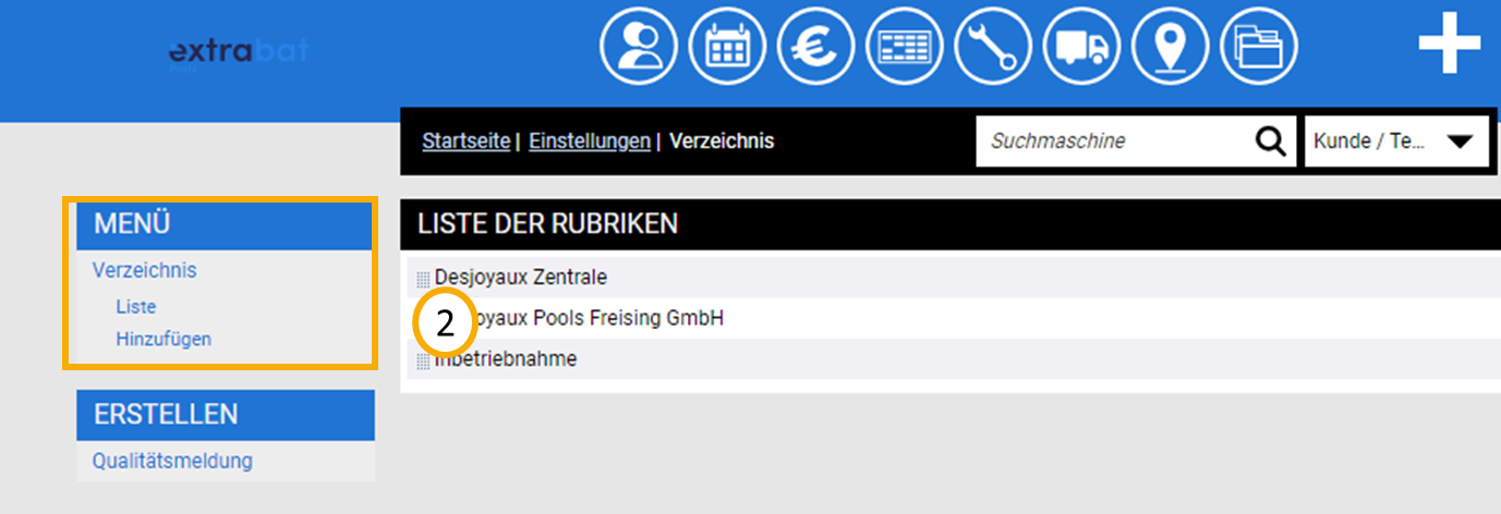 Dort öffnen Sie den Bereich "Verwaltung der Rubriken" (1). Sie haben nun im Auschluss die Möglichkeit durch "Hinzufügen" neue Rubriken zu ergänzen (2).