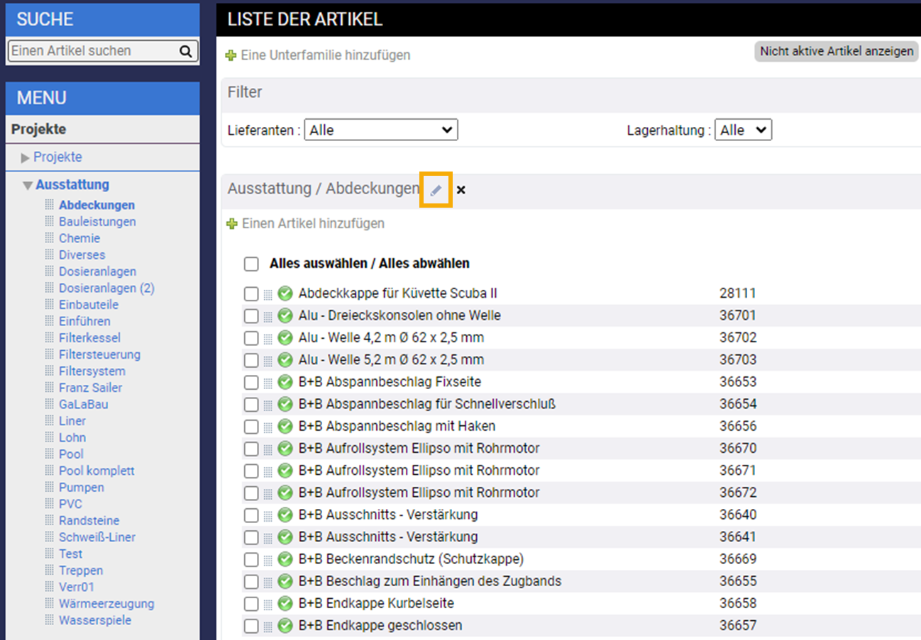 Möchten Sie eine bestehende Ausstattungskategorie bearbeiten, können Sie wie folgt tun. Klicken Sie zuerst die entsprechende Kategorie an und wählen dann die Bearbeitungsfunktion aus: