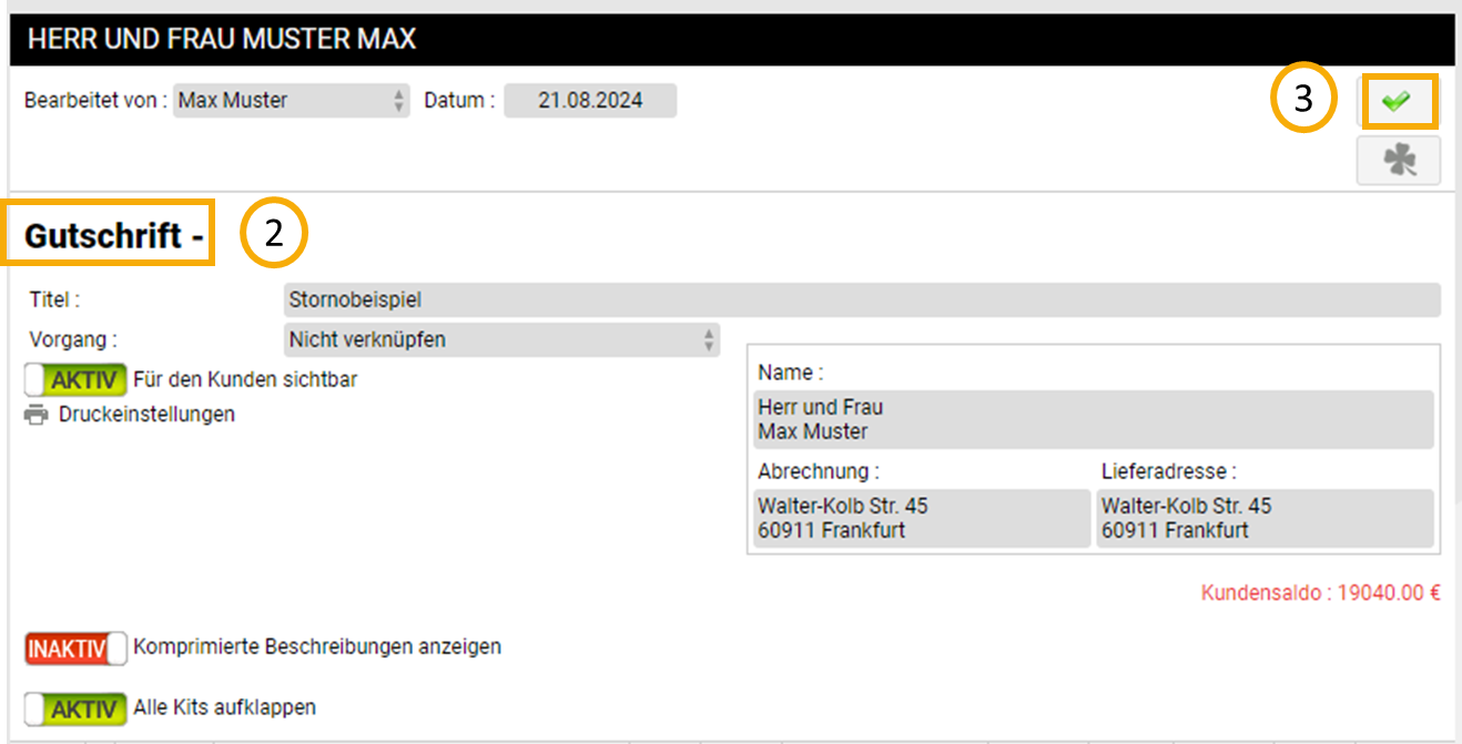 | Sie werden feststellen, dass sich der Status der Rechnung in Gutschrift geändert hat (2). Bestätigen Sie die Umwandlung indem Sie auf den grünen Haken oben rechts klicken (3). |