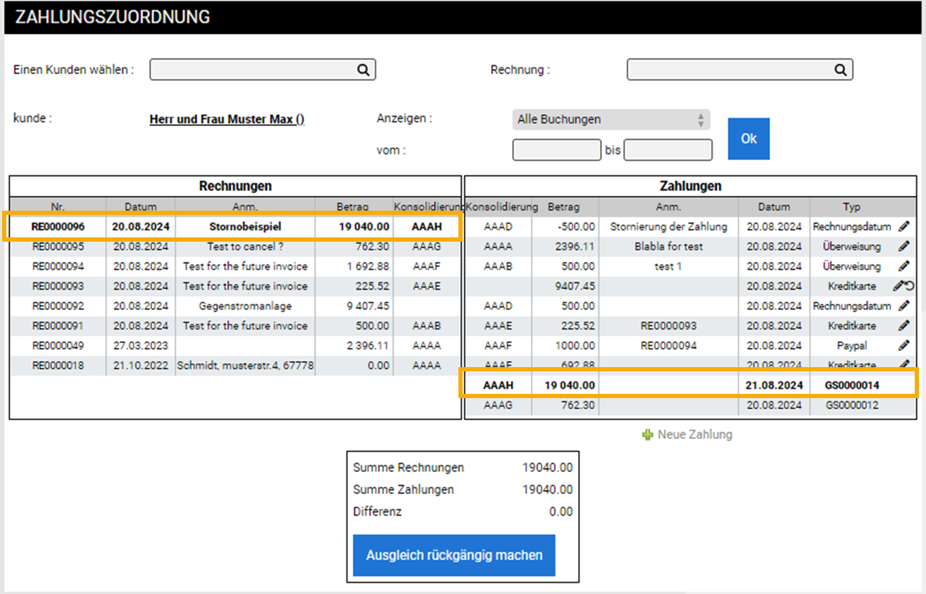 | Beide Datensätze verschwinden im Anschluss. Sofern Sie die Ansicht auf "alle Buchungen" ändern, werden Sie feststellen, dass die beiden Datensätze (Rechnung und Gutschrift) einander zugeordnet sind. |