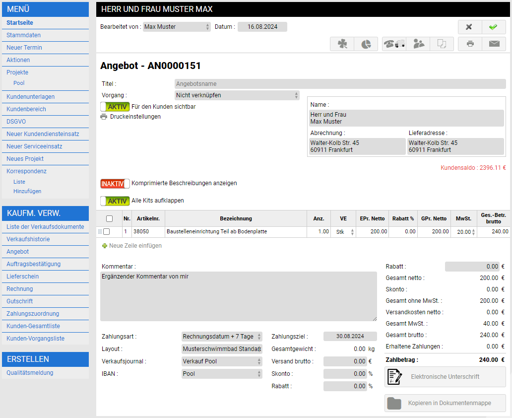 Der Unterschied zwischen Korrespondenz-Vorlagen und Nachrichtenvorlagen liegt in Ihrer Verwendung. Wohingegen Nachrichtenvorlagen wie Standard-Mail-Vorlagen verstanden werden können, die Sie verwenden können, um ein Angebot direkt via E-Mail versenden zu können (1), so sind Korrespondenz-Vorlagen dafür gedacht Standard-Anschreiben zu generieren (2).