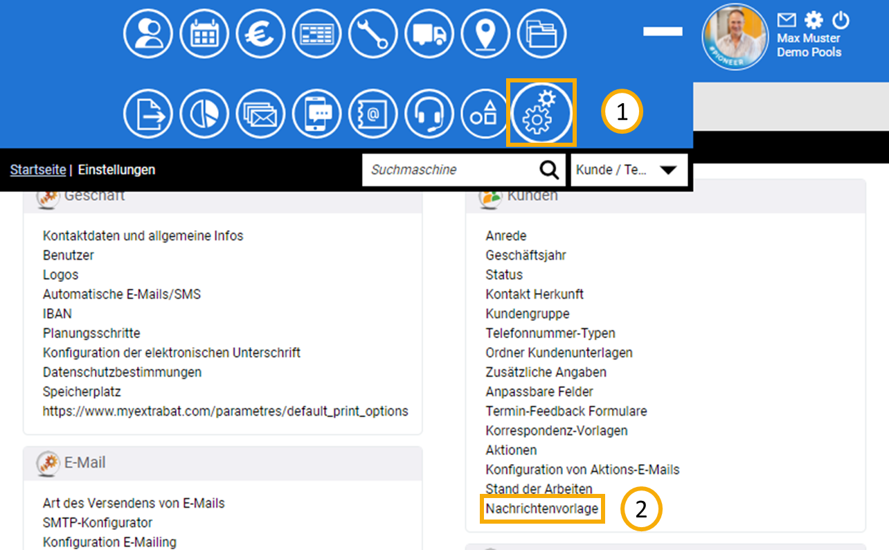 Um eine vorhandene E-Mail-Schablonen überarbeiten zu können, navigieren Sie zunächst in Ihre "Einstellungen" (1). Begeben Sie sich anschließend in den Unterbereich "Nachrichtenvorlagen" (2).