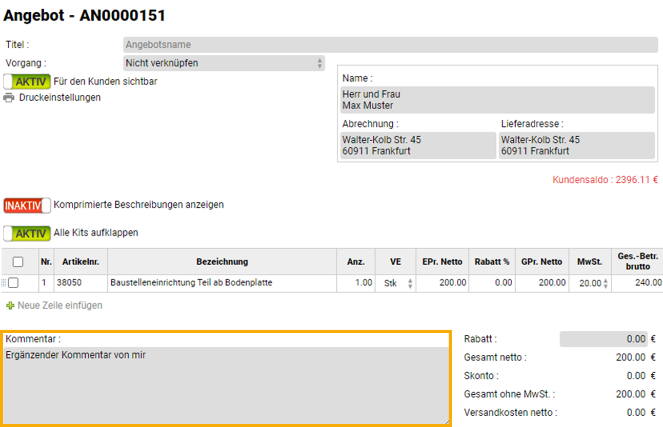 Kommentare auf beispielsweise Angeboten oder Rechnungen kann man auch als abschließende Nachtexte verstehen mit denen Sie dem Kunden zusätzliche Informationen zu den vorangegangenen Positionen kommunizieren möchten.