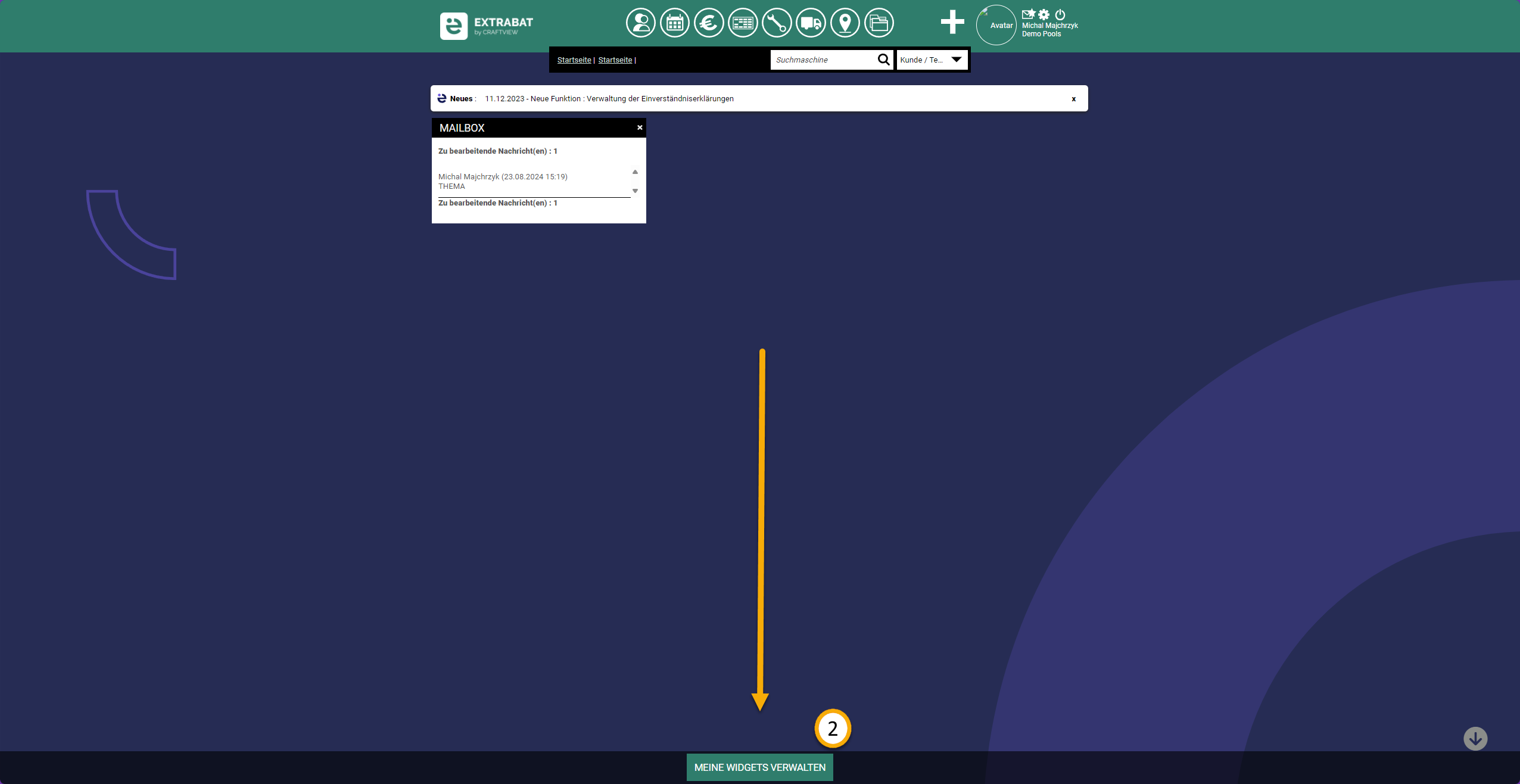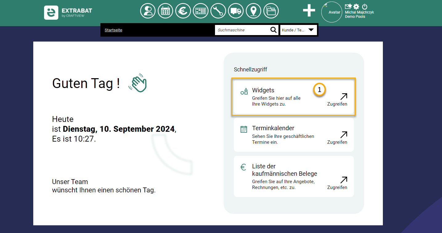 Die Liste der verfügbaren Widgets können Sie abrufen indem Sie auf der Startseite auf "Widgets" rechts klicken: