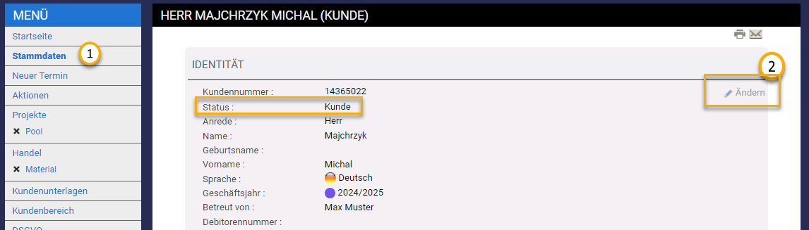Das können Sie erzielen indem Sie auf die Kundenadresse gehen und unter den Punkt "Stammdaten" auf das "Ändern" Symbol klicken bei "Identität":